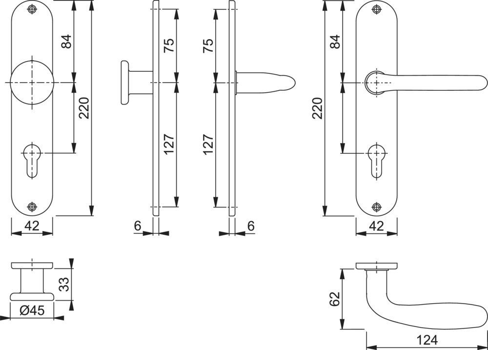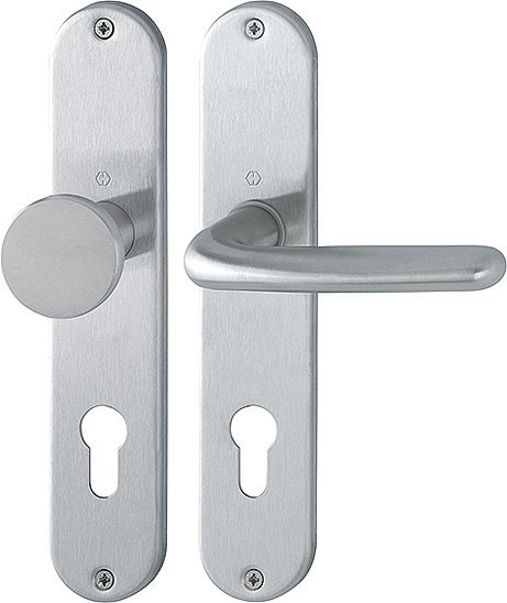 Wechselgarnitur Cardiff E48/302/1850Z; Produkttyp: Wechselgarnitur; Produkttyp (Hersteller): Wechselgarnitur; Ausführung: Langschild; Befestigungsart: sichtbar verschraubt; Befestigungstechnik: ohne Stütznocken; Form: oval; Vierkant: 8 mm; Material: Edelstahl; Form Türgriff (innen): L-Form; Form Türgriff (außen): Flachknopf; Ausführung Türgriff (außen): fest; Gewinde Knopf/Griffplatte: M12; Durchmesser Türgriff (außen): 45 mm; Länge Türgriff (innen): 124 mm; Höhe Türgriff (innen): 62 mm; Höhe Türgriff (außen): 33 mm; Schildbreite außen: 42 mm; Schildbreite innen: 42 mm; Schildlänge außen: 220 mm; Schildlänge innen: 220 mm; Schildstärke außen: 6 mm; Schildstärke innen: 6 mm; Lagerung: wartungsfreies Gleitlager; Einsatzbereich: Objekttür,Wohnungseingangstür; Türart: Vollblatt; Türwerkstoff: Holz,Stahl; Lochung: Profilzylinder gelocht; Entfernung: 72 mm; DIN-Richtung: DIN Links-Rechts; Farbe: grau; Farbton: edelstahl matt; Ausführung Vierkant: Rollenwechselstift; Türstärke min.: 37 mm; Türstärke max.: 47 mm