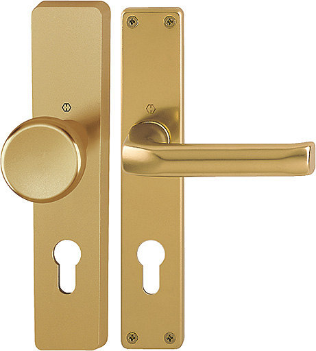 Wechselgarnitur London 54/227/202SP/113; Produkttyp: Wechselgarnitur; Produkttyp (Hersteller): Wechselgarnitur; Ausführung: Langschild; Befestigungsart: innen sichtbar verschraubt; Befestigungstechnik: ohne Stütznocken; Form: konisch; Vierkant: 8 mm; Material: Aluminium; Form Türgriff (innen): L-Form; Form Türgriff (außen): Flachknopf; Ausführung Türgriff (außen): fest; Gewinde Knopf/Griffplatte: M12; Durchmesser Türgriff (außen): 50 mm; Länge Türgriff (innen): 120 mm; Höhe Türgriff (innen): 54 mm; Höhe Türgriff (außen): 39 mm; Schildbreite außen: 48 mm; Schildbreite innen: 40 mm; Schildlänge außen: 220 mm; Schildlänge innen: 215 mm; Schildstärke außen: 10 mm; Schildstärke innen: 7 mm; Lagerung: wartungsfreies Gleitlager; Einsatzbereich: Wohnungseingangstür,Objekttür; Türart: Vollblatt; Türwerkstoff: Stahl,Holz; Lochung: Profilzylinder gelocht; Entfernung: 72 mm; DIN-Richtung: DIN Links-Rechts; Farbe: braun; Farbton: bronzefarben; Oberfläche: eloxiert; Ausführung Vierkant: Rollenwechselstift; Türstärke min.: 37 mm; Türstärke max.: 42 mm