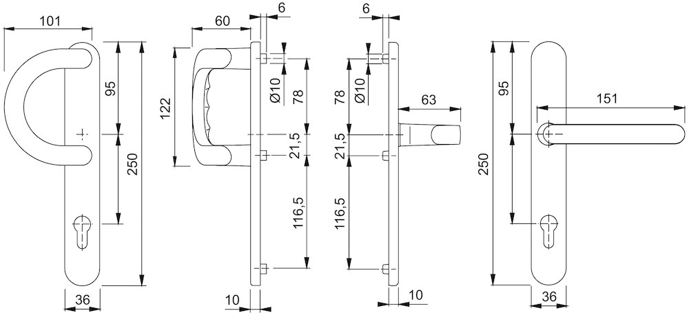 HOPPE®, Profiltür-Wechselgarnitur, Abdeckung: Schmalschild, Modell: Luxembourg, Modellnummer: 513G/3357N/1500, Lochung: Profilzylinder gelocht, Entfernung: 92mm, Vierkant: 8mm, Material: Aluminium, Farbton: natur matt, Oberfläche: eloxiert, DIN-Richtung: DIN Links-Rechts, Lagerung: Gleitlager, wartungsfrei, festdrehbar, Rückholfeder, Befestigungsart: verdeckt verschraubt, Befestigungstechnik: mit Stütznocken,Material Unterkonstruktion : Zamak, Befestigungssystem: Stiftverbindung,Drückerform : gebogen,Drückerlänge : 152mm,Drückerhöhe : 63mm, Eigenschaft: Stoßgriff fest auf Schild, Länge: 250mm, Breite: 36mm, Stoßgriffform: halbrund gebogen, Stoßgrifflänge: 122mm, Stoßgriffbreite: 101mm, Stoßgriffhöhe: 60mm, Anschlagrichtung: Drücker rechts/links verwendbar, Drückerbefestigung: Profilvollstift, Form: oval, Schildstärke außen: 10mm, Schildstärke innen: 10mm, Türstärke min.: 57mm, Türstärke max.: 62mm, Türart: Außentüren, Rahmentüren, Türwerkstoff: Aluminium, Kunststoff