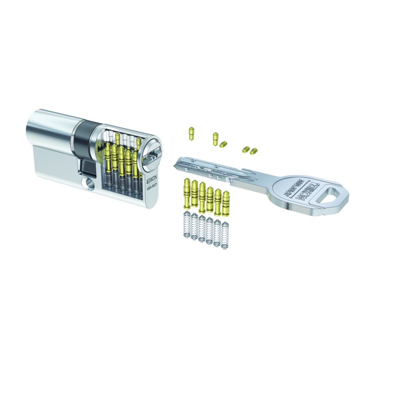 - 6 sechs aktiv wirkenden, gefederte Stiftzuhaltungen nach DIN EN 1303 bzw. DIN 18252 = Aufsperr-, Abtast- und Nachschließsicherheit