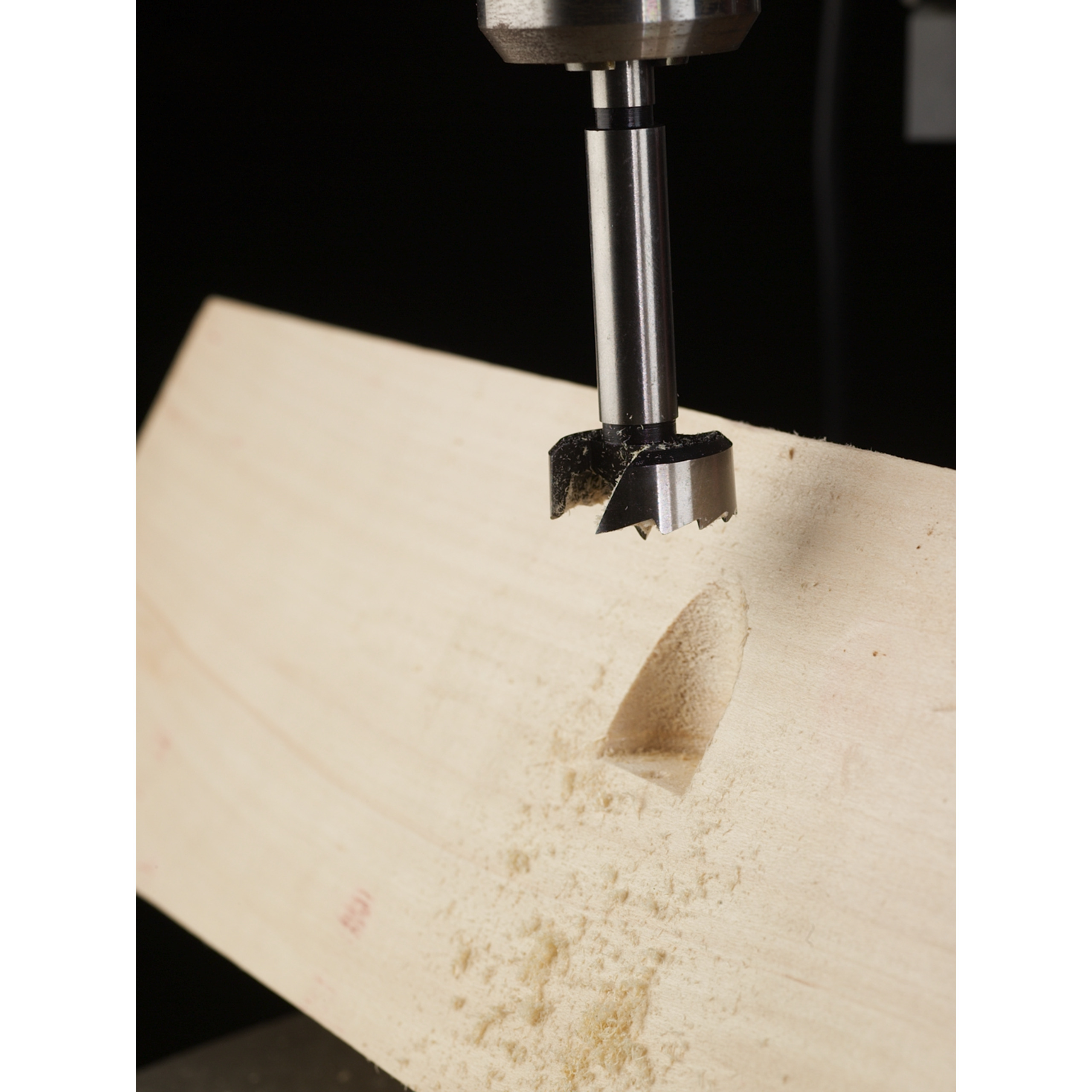 - Zentrierspitze für punktgenaues Anbohren, Nebenschneiden zum Bohren ausrissfreier, maßhaltiger Sacklöcher sowie Rundlaufbohrungen in allen weichen und harten Naturhölzern