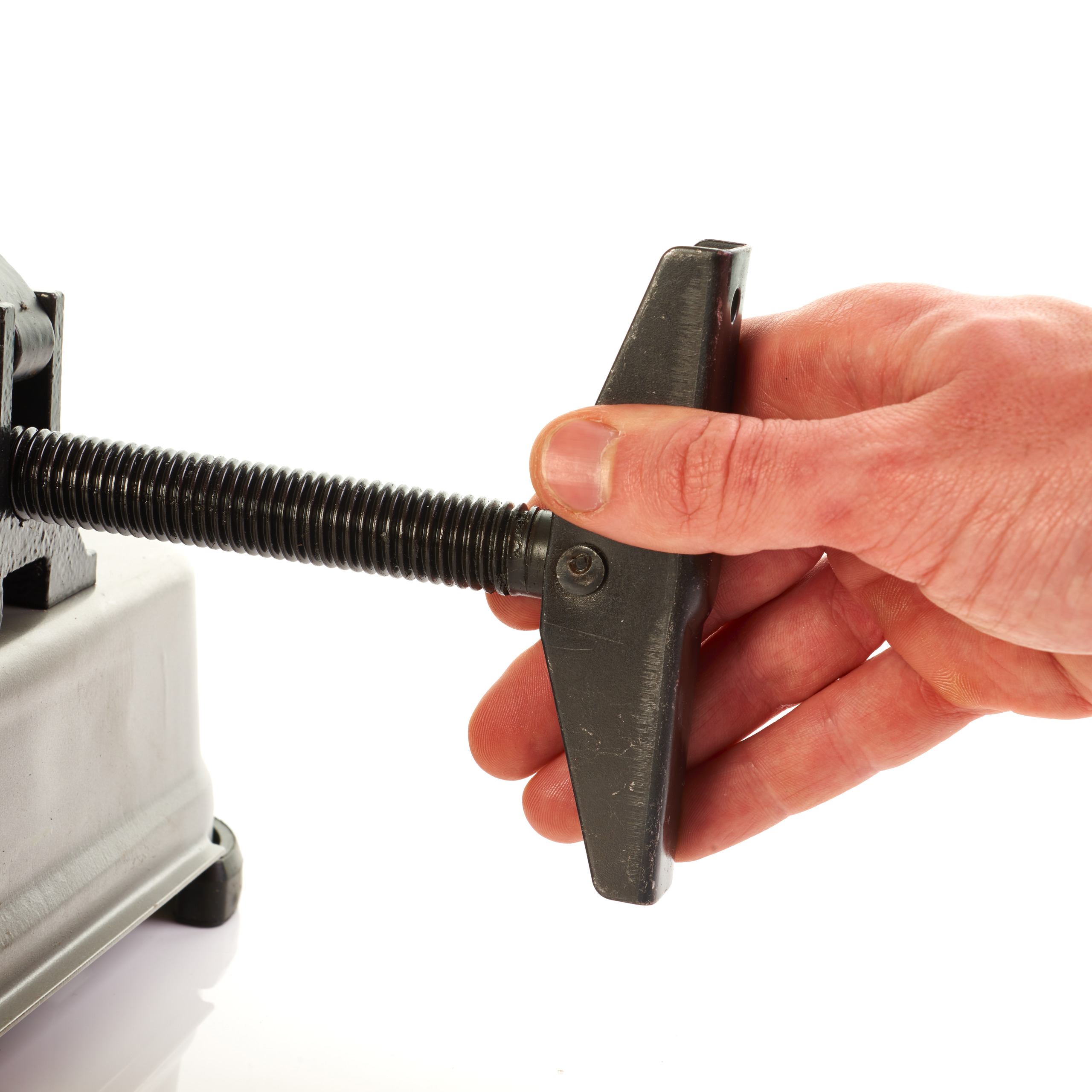 - Schnellspannvorrichtung mit stufenloser Gehrungsumstellung für Winkelschnitte von – 45° bis + 45°