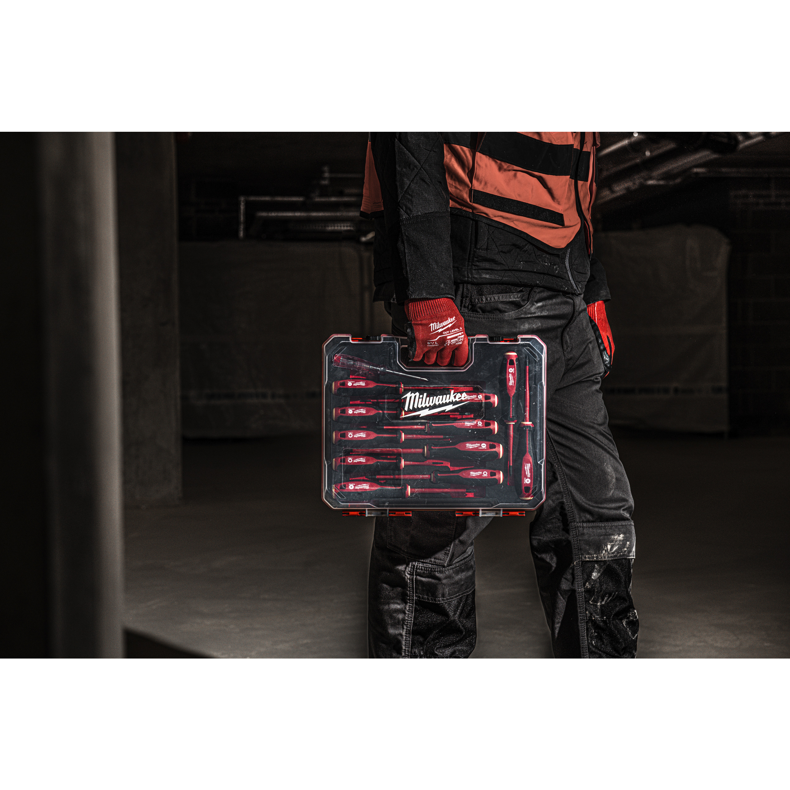 Produktinformationen Durchschlagsprüfung bis 10.000 V AC, Arbeiten bis 1.000 V AC abgesichert Dünner Schaft für leichteren und sicheren Zugang zu tief liegenden Schrauben Komfortabler Tri-Lobe Handgriff optimiert für hohen Anwenderkomfort und hohe Kraftübertragung Permanent sichtbare Größenmarkierung für schnelle Identifizierung des richtigen Werkzeugs Anti-Roll-Design des Handgriffs Lochung zur leichten Fixierung an einer Milwaukee® Werkzeugsicherung bei Arbeiten in der Höhe