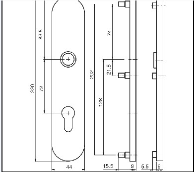 OGRO Langschild PR 7021L, oval, 220x44 mm, mit Hochhaltemechanismus, PZ gelocht, 72 mm Entfernung, 24.5 mm ø DL - Edelstahl matt