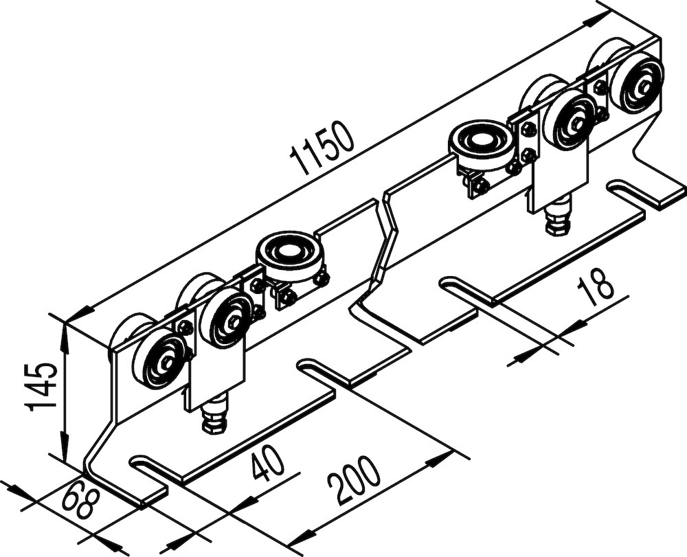 HELM Schiebetor Rollapparat, Modellnummer: 563, Ausführung: doppelpaarig, mit Gegendruckrolle, mit zwei Querrollen, Achsen: zweiachsig mit Querrollen und Gegendruckrollen, Material Rollapparat: stahl, Farbton Rollapparat: blau chromatiert, Oberfläche Rollapparat: galvanisch verzinkt, für Profil-Nr.: 500, Befestigungsart: zum Einhängen, Material Rollen: stahl, Plattenbreite: 68 mm, Stärke Bodenausgleichsplatte: 25 mm