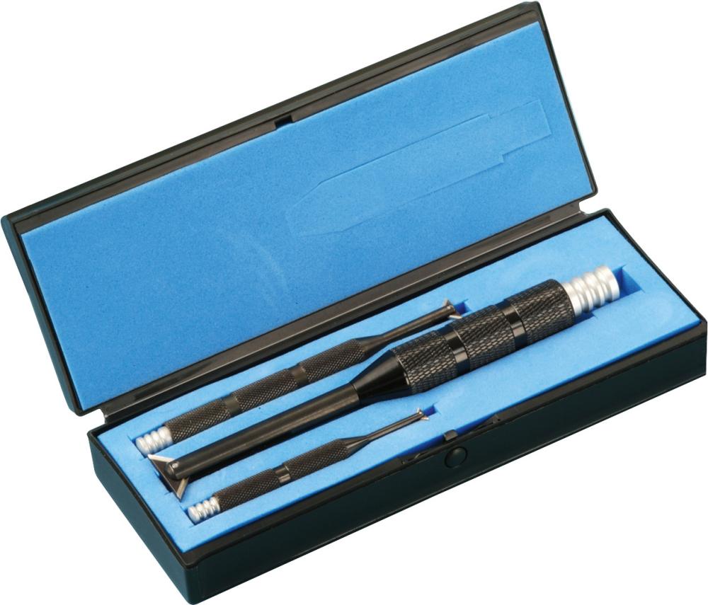 Hinweis: Durch Drücken des hinteren Knopfes schwenkt die Klinge in den Schaft, und das Werkzeug kann durch die Bohrung geführt werden (siehe Skizze). Die Klingen schneiden beidseitig.