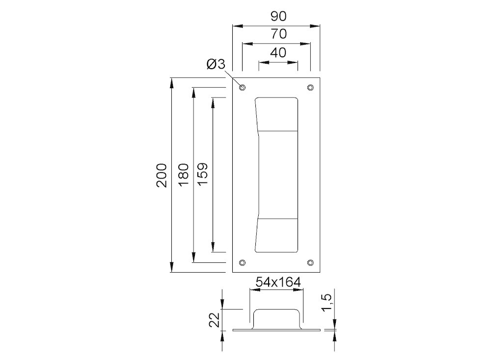 KWS Objekttür Schiebetürmuschel, Modellnummer: 5207, Lochung: ohne Lochung, Form: eckig, Material: aluminium, Farbton: silberfarbig, Oberfläche: eloxiert, geschliffen, poliert, Befestigungsart: Zum Anschrauben, Anzahl Schraublöcher: 4 mm, Schraublochdurchmesser: 3 mm, Schraublochentfernung Breite: 70 mm, Schraublochentfernung Länge: 180 mm, Länge: 200 mm, Breite: 90 mm, Tiefe: 22 mm, Stärke: 1.5 mm, DIN-Richtung: DIN Links-Rechts, Türart: Schiebetür, Türwerkstoff: Holz