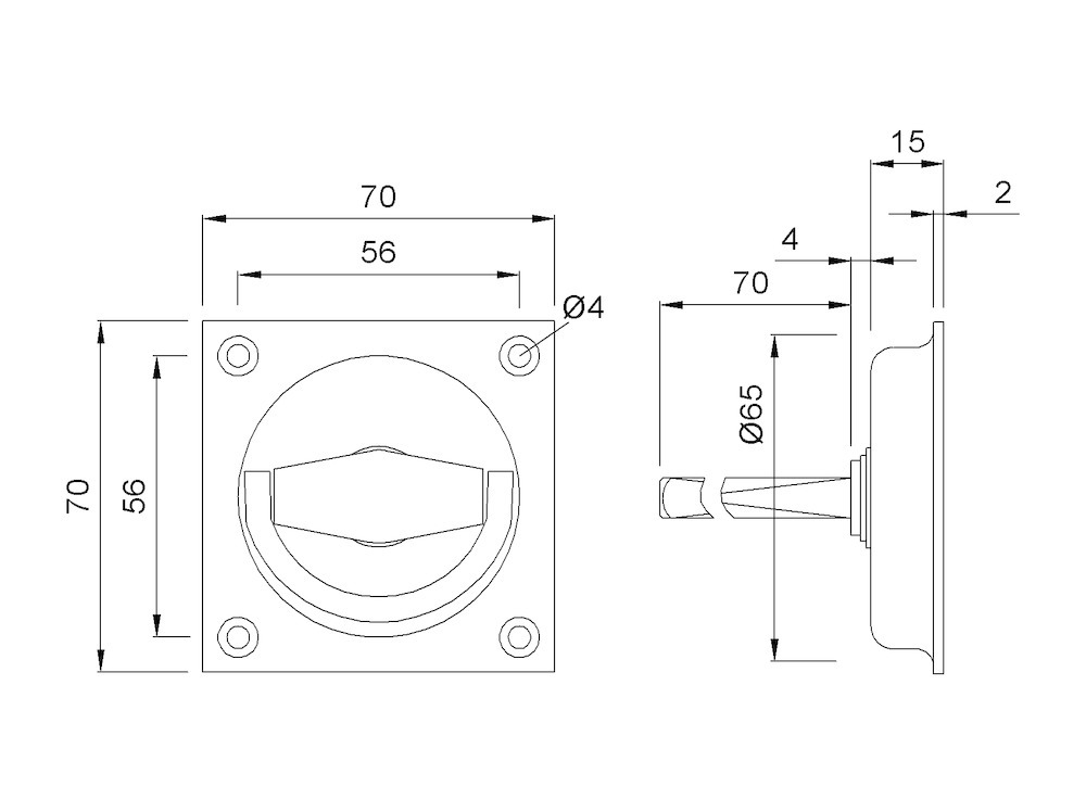 KWS Objekttür Schiebetürmuschelgriff, Modellnummer: 5013, Vierkant: 8, Form: eckig, Befestigungsart: sichtbar verschraubt, Bohrdurchmesser: 65 mm, Material: stahl, Farbe: schwarz, Oberfläche: einbrennlackiert, DIN-Richtung: DIN Links-Rechts, Lagerung: festdrehbar, Türwerkstoff: Holz, Türart: Schiebetür, Ausführung: Lochteil, mit Klappring, Material Griffmulde: stahl, Material Klappring: aluminium, Breite: 70 mm, Länge: 70 mm, Tiefe: 19 mm, Schraublochdurchmesser: 4 mm, Schraublochentfernung 1: 56 mm, Schraublochentfernung 2: 56 mm