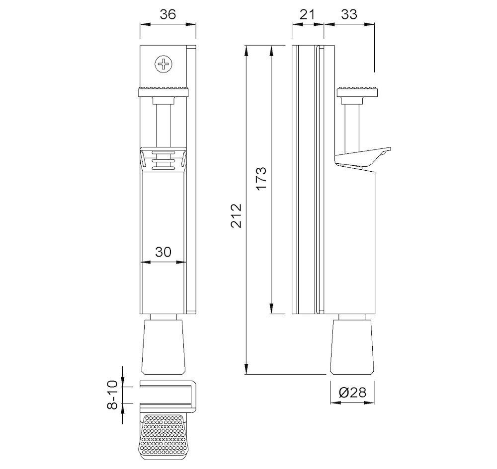 KWS Objekttür Türfeststeller, Ausführung: mit Tretbolzen, mit Gummistopfen, mit Konterfeder, mit Klemmplatte, Modellnummer: 1133, Befestigungsart: Klemmbefestigung für Glastüren, Material: aluminium, Farbton: Neusilber, Oberfläche: eloxiert, geschliffen, poliert, Breite: 36 mm, Hub: 30 mm, DIN-Richtung: DIN Links-Rechts, Türgewicht max.: 40 kg, Material Tretbolzen: edelstahl, Türstärke min.: 8 mm, Türstärke max.: 10 mm, Farbe Gummi: grau