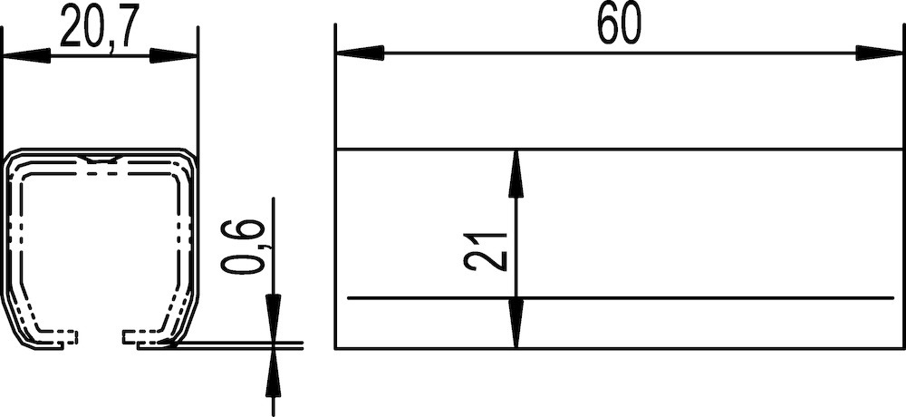 HELM Schiebetor Verbindungsmuffe, Modellnummer: 13/03, Ausführung: mit Bohrung, für Profil-Nr.: 13, Befestigungsart: zum Aufstecken und Verschrauben, Höhe: 21 mm, Länge: 60 mm, Material: stahl, Oberfläche: galvanisch verzinkt, Zusatzinformation: für passgenaue Verbindungen von zwei Schienen