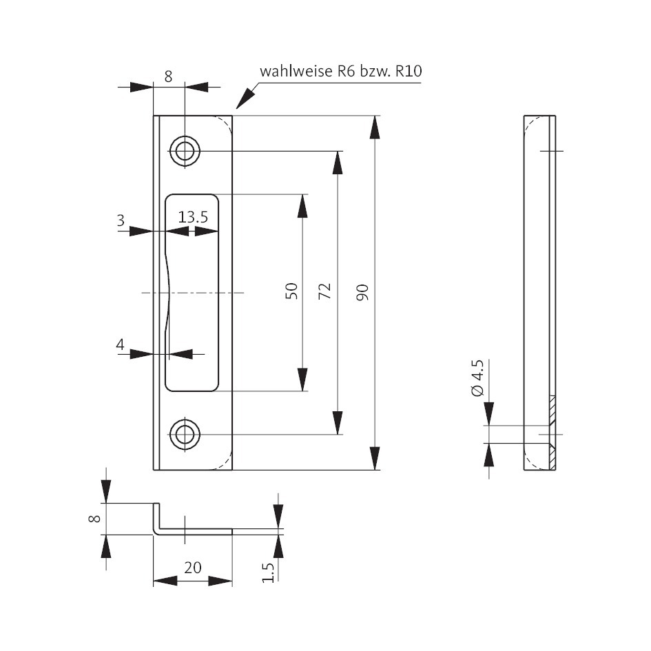 BKS Türrahmen Winkelschließblech, Modellnummer: S400, Material: stahl, Schließblechbreite: 20 mm, Schließblechausführung: kantig, DIN-Richtung: DIN Links-Rechts, Farbton: nickelsilber, Oberfläche: lackiert, Türausprägung: Türe gefälzt, Türflügelanzahl: einflügelig, Befestigungsart: zum Aufschrauben, Schließblechlänge: 90 mm, Schließblechstärke: 1.5 mm, Schließblechtiefe: 8 mm, Türart: Abschlusstür, Rahmenwerkstoff: Holz, Kunststoff, Kunststoff, stahl, Ausführung: mit Fallenausschnitt